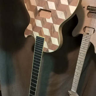 Tessellating top constructed from just under 100 individual pieces of maple, mahogany & rosewood.