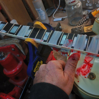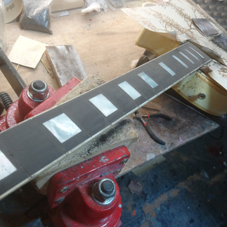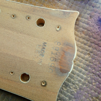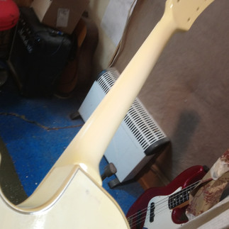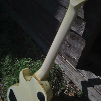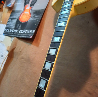 "As you'd expect this early 70's beauty had been repaired prior to visiting our workshop. After adding two 4" maple splines, a full refret and new binding with nibs she received a full neck refin in a custom tinted nitro to match the beautifully aged body"